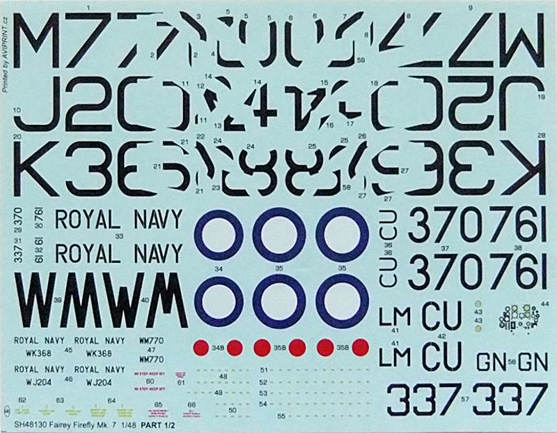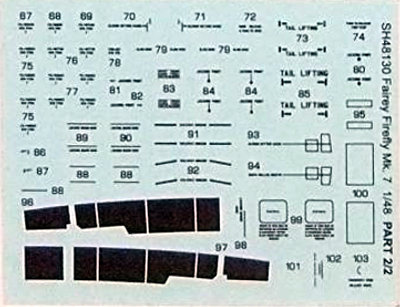 Bemalung: Die Auswahl der Decals ist reichhaltig und beinhaltet auch viele Stencils (Wartungshinweise). Es kann eine von drei Maschinen gebaut werden. Alle im britischen Standartanstrich für Marineflugzeuge, Extra Dark Sea Grey oben und Sky unten. Die Firefly aus dem Jahre 1956 der RNAS Culdrose hat den Zusatztank nur unter dem linken Flügel. Die selbe Maschine aus dem Jahr 1953-54 verfügt über die Tanks beidseitig. Als drittes gibt es noch die MK.7, ebenfalls aus dem Jahr 1953-1954, der RNAS Eglinton.