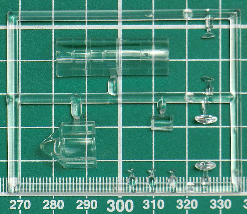 Gut verpackt enthält die unpraktische Schüttbox drei hellgraue Spritzlinge mit 85 Einzelteilen, einen Rahmen mit zehn Klarsichteilen, zehn Resinteile, einen neuen größeren Fotoätzteilbogen und dünne ohne Versatz auf hellblauem Trägerpapier gedruckte Decals.
