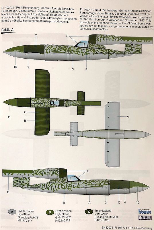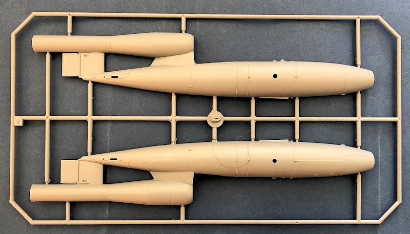 Ein Höhepunkt ist der vordere Bereich der Raketenturbine. Dieser wird durch vier separate Teile optimal dargestellt. Ebenso lobenswert ist die Idee, dass man drei unterschiedliche Abdeckungsoptionen für die Raketennase erhält, die auch mit Referenzbildern belegt werden können. Alle Oberflächenstrukturen sind mit sauberen Gravuren stimmig wieder gegeben, wobei man ein korrektes Seitenleitwerk findet, das bei der Re-4 etwas größer war als bei der V1. Die Steuerruder an den Tragflächen liegen als separate Teile bei und beide Tragflächen können entweder im montierten oder Transportmodus dargestellt werden. Dafür liegen auch die passenden Halterungen bei, die mit PE Streifen angebracht werden können. Tolle Idee! Die Klarsichthaube ist stimmig und aus hochtransparentem Material - eventuell etwas zu dick. Mir ist dabei aufgefallen, dass im Bauplan vergessen wurde darauf einzugehen, das beiliegende Panzerglas einzubauen.