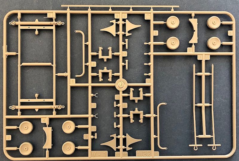 Die Teile für den Transportkarren 76A sind ebenfalls super. Hier hat man die Fehler des Bronco Bausatzes nicht kopiert sondern alles richtig gemacht. Dies betrifft die Gestaltung des Hauptrahmens, der aus zwei Teilen besteht, die im Original mittig ineinander gesteckt werden konnten. Außerdem wurde die Lenkung des Karrens richtig wieder gegeben. Wer hier noch weitere Details anbringen will, kann noch den Arretierstift anbringen, mit dessen Hilfe in der Regel die hintere Achse in "Gerade-Aus-Position" fixiert wurde.