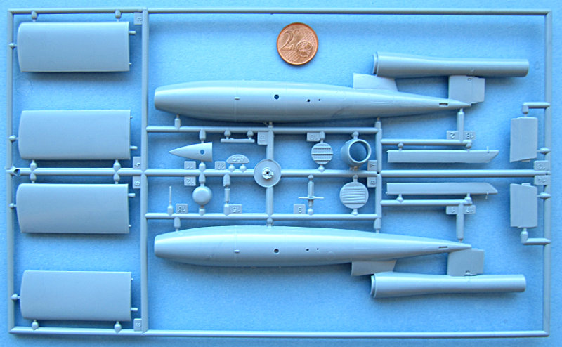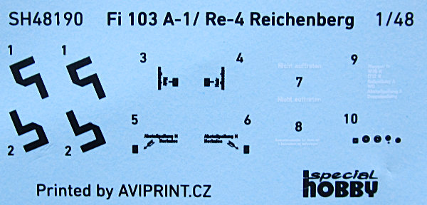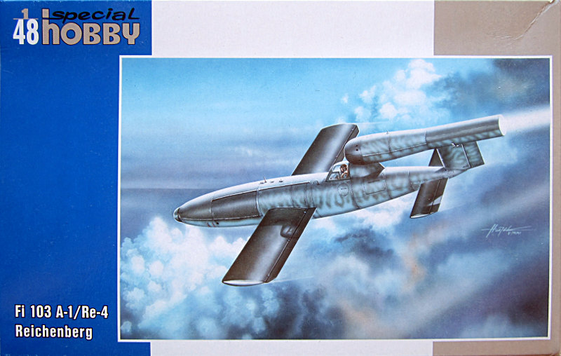 Bausatz: Special Hobby bring nach und nach, die unter dem Label MPM erschienen Bausätze in der eigenen Produktlinie wieder heraus. Dazu gehört auch die 2006 erstmals erschienene Fieseler Fi 103 Reichenberg. Der Bausatz ist einfach gehalten und besteht aus einem grauen Spritzling und der klaren Cockpitkanzel. Die Detaillierung ist sehr simpel, was aber dem Original entspricht und daher passend ist. Grundsätzlich ist die Form der V-1 von MPM/Special Hobby deutlich besser getroffen als z.B. von Tamiya.