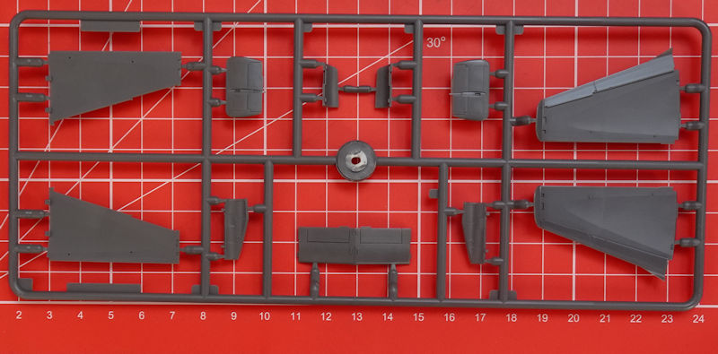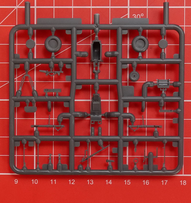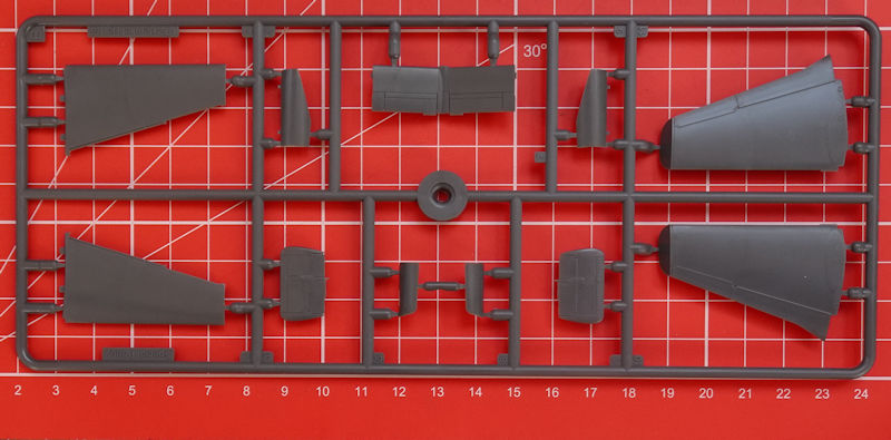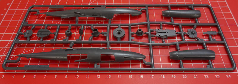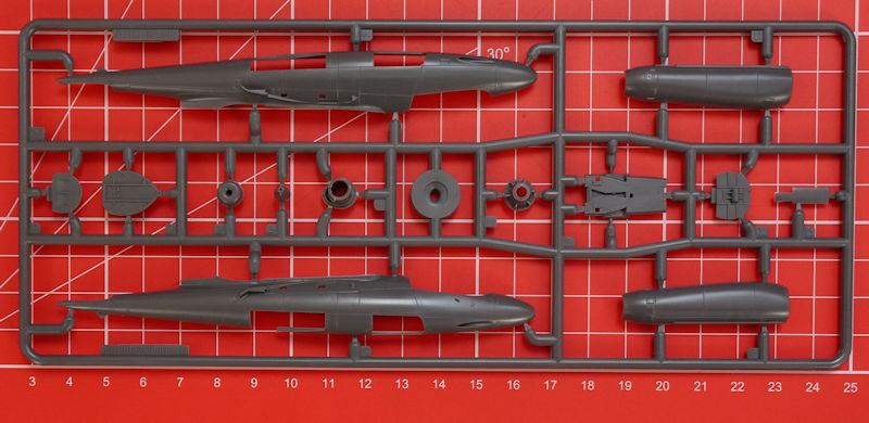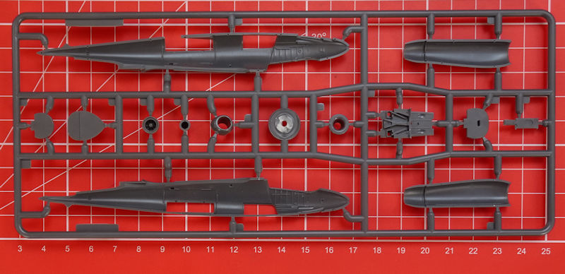 In der attraktiven aber unpraktischen Schüttbox befinden sich gut verpackt drei dunkelgraue Spritzgussrahmen mit 49 Teilen, ein klarer Spritzgussrahmen mit drei Teilen, ein Decalbogen und die mehrfarbige Bau- und Bemalungsanleitung. Die Teile entsprechen dem sehr hohen Standard von special hobby. Es gibt feine versenkte Strukturen und eine sehr sinnvolle Aufteilung der Bauteile. Auswerfermarken sind nur an später unsichtbaren Punkten platziert. Ein Höhepunkt ist für mich der Spritzling mit den Kleinteilen. Hier gibt es einen ordentlichen Schleudersitz mit feinsten Angüssen, detaillierte Fahrwerksbeine, Seitenruderpedale u.v.m. Trotzdem hat man im eigenen Hause nicht weniger als vier Detailsets in Resin(Siehe Kartonrückseite unten!) geplant.