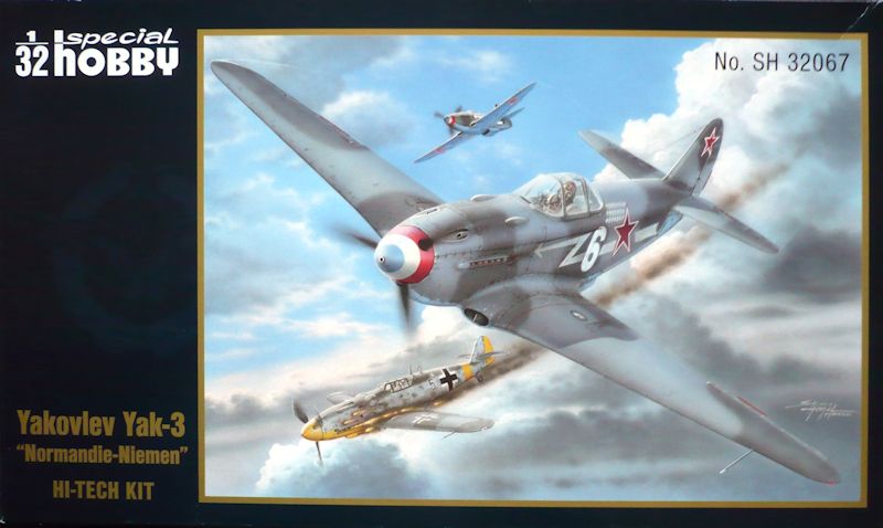Bausatz: Anfang 2016 kündigte Special Hobby diesen Bausatz zur großen Freude an. Nun ist er da. Die Yak-3 als Hi-Tech Bausatz in einer attraktiv gestalteten Verpackung - zwei Yaks schießen eine Bf 109 ab. Der Bausatz besteht aus vier großen Spritzrahmen mit 123 Teilen, einem geteilten Spritzrahmen mit zwei Tragflächenteilen, zwei identischen Rahmen mit je neun Klarsichteilen. Dazu kommen 14 graue Resinteile, ein Fotoätzteilbogen und ein Maskiersatz in einer Blisterpackung von CMK sowie zwei Decalbögen und natürlich die Bauanleitung.