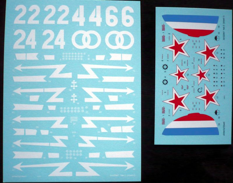 Bemalung: Die Abziehbilder sind sauber und randscharf gedruckt und gefallen dazu noch durch einen dünnen Trägerfilm. Die Farbsättigung der weißen Decals fällt sehr gut aus, ein Durchschimmern des Untergrundes dürfte nicht auftreten. Die 16-seitige farbige Bauanleitung führt klar und übersichtlich durch 46 Bauabschnitte. In sämtlichen Bauabschnitten wird immer wieder auf die Farbgebung der Bauteile hingewiesen. Am Ende werden alle fünf Varianten in allen Perspektiven für das äußere Finish beschrieben.