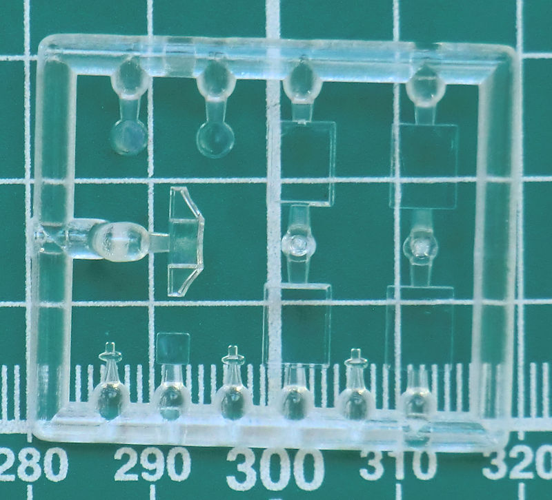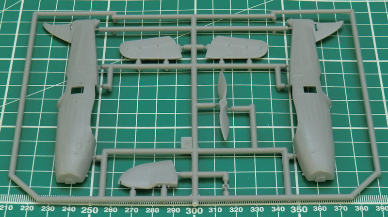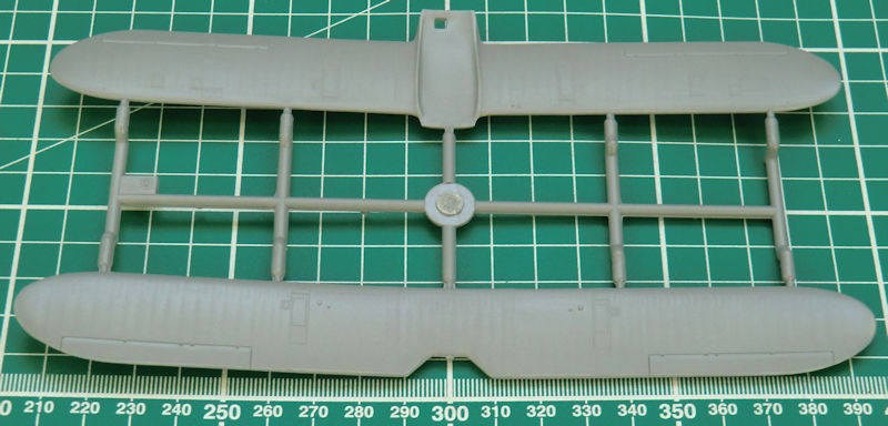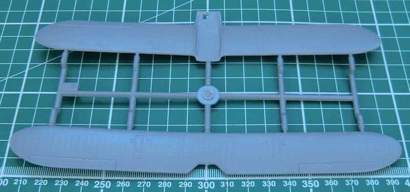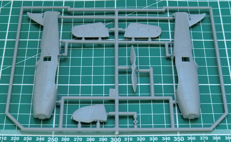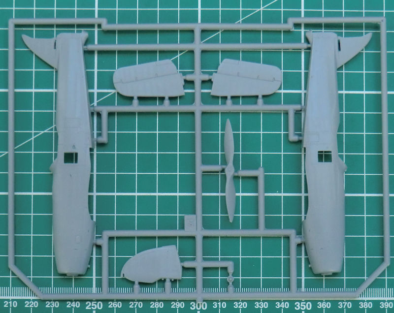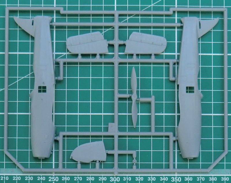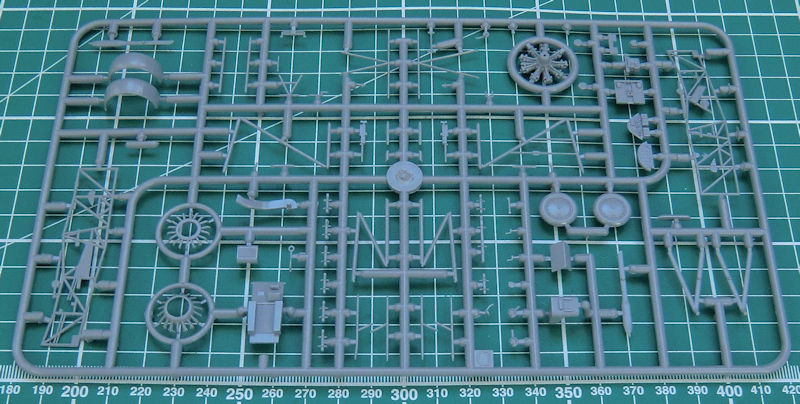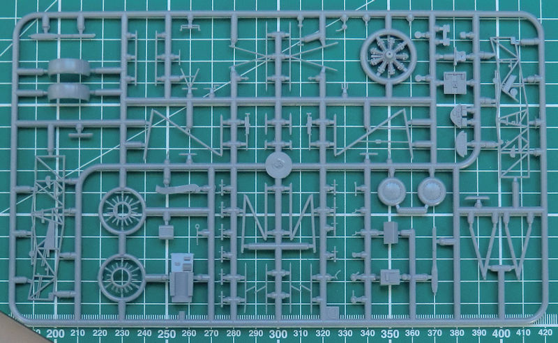 Es gibt die Spritzlinge für den Rumpf und die Tragflächen doppelt. Ein paar weitere Teile sind für andere Versionen bestimmt und wandern ebenfalls in die Restekiste. Die Abspritzung der Bauteile ist sehr gut. Ich möchte hier insbesondere die filigranen Kleinteile hervorheben.. Der Bau beginnt mit dem schweren Abwehr-MG. Das entsteht aus dreizehn Teilen. Dann folgt der Motor und dieser ist sehr filigran und detailliert. Er wird aus drei Teilen zusammengebaut.
