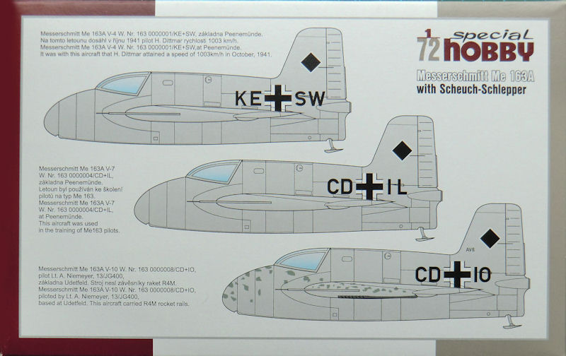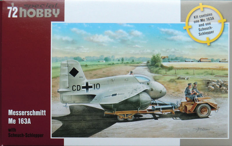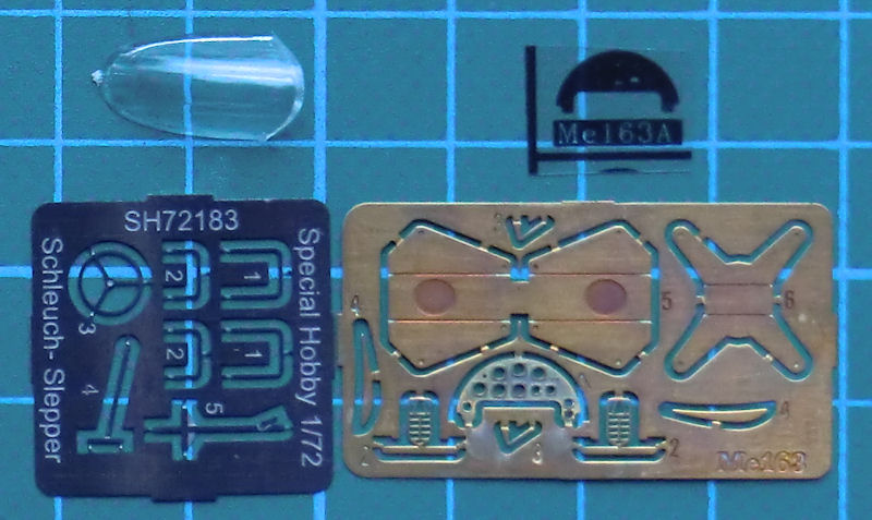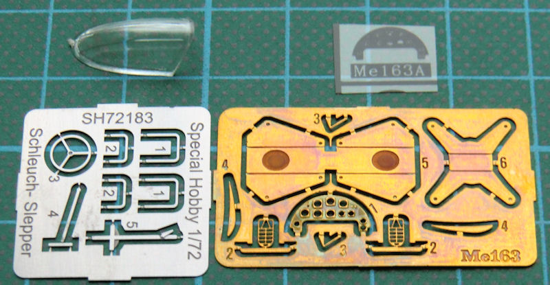 Bausatz: Special Hobby hat jetzt dankenswerter Weise die Me 163A wieder auf dem Markt gebracht. Ende der 90er Jahre erschien der Basisbausatz unter dem Label Condor. Nun hat man Spritzgussteile mit Resin- und Fotoätzteile kombiniert und bringt es unter dem Label Special Hobby neu heraus.