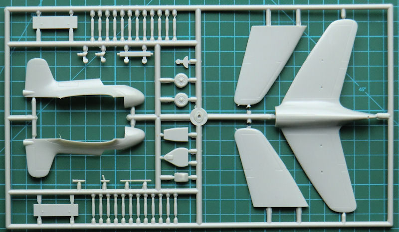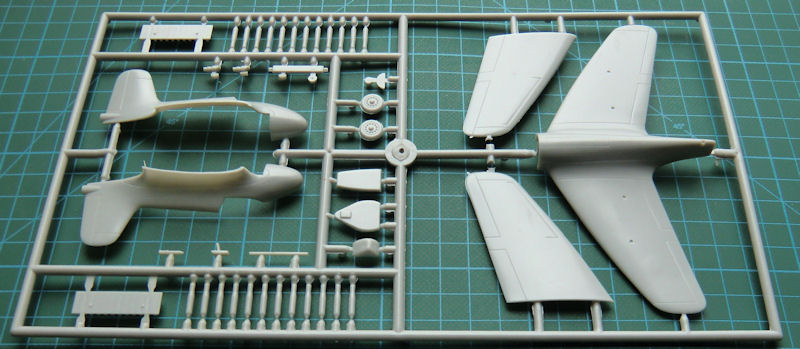 In der attraktiven aber unpraktischen Schüttbox befinden sich gut verpackt ein hellgrauer Spritzling mit 43 Teilen, ein dunkelgrauer Spritzling mit 28 Teilen, zwei Bögen Fotoätzteile, sieben Resinteile, ein Klarsichtteil, ein Fotofilm für die Instrumente, ein Decalbogen und die informative Bauanleitung.