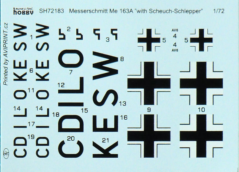 Die Farbhinweise enthalten RLM- und Gunze-Sangyo-Nummern. Alle Decals sind ohne Versatz auf hellblauem Trägerpapier bei AVIPRINT gedruckt. Die Hoheitszeichen für das Seitenleitwerk sind geteilt.