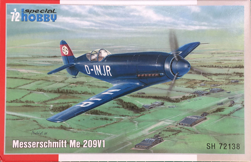 Bausatz: Schon in den 1980er Jahren gab es bei HUMA in 1/72 einen Spritzgussbausatz. Dieser war für die damalige Zeit durchaus in Ordnung. HUMA hatte vor mehr als zehn Jahren die Produktion eingestellt und daher war auch dieser Bausatz nicht mehr erhältlich. Die Formen sind noch vorhanden… Was damit passiert wird die Zukunft zeigen. Damit war nur special hobby am Zuge. Der Hersteller aus Prag hat nun einen neuen Bausatz der Me 209 V-1 herausgebracht. In der attraktiven aber unpraktischen Schüttbox befinden sehr gut verpackt zwei hellgraue Spritzlinge mit 57 Einzelteilen, ein Klarsichtteil, ein Decalbogen und die mehrfarbige Bau- und Bemalungsanleitung.