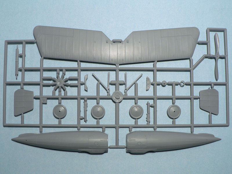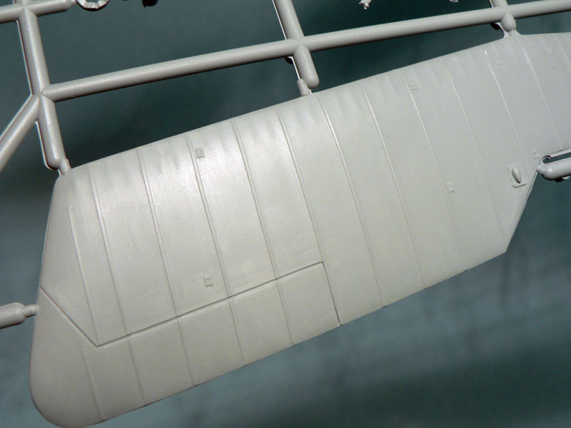 Die bespannte Oberflächen sind sehr fein dargestellt, aber die Verstärkungsstreifen sind, wie immer in Modellbausätzen, übertrieben. Man sollte sie in jedem Fall ein wenig reduzieren. Die sehr feine Tragfläche ist ein Einzelteil und war in meinem Bausatz, was sehr wichtig ist, nicht verformt.