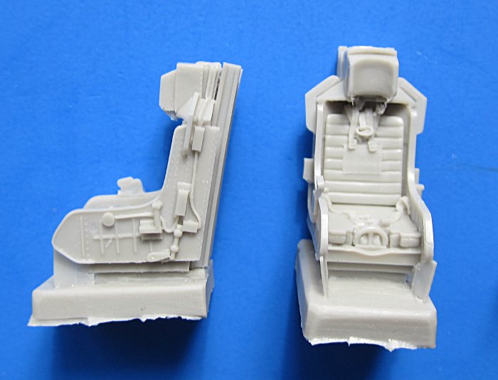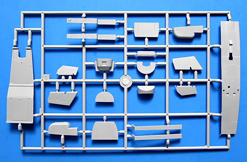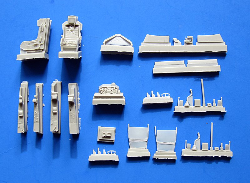 Der Bausatz stammt aus den moderneren Tools von MPM. Das heißt die Oberflächengüte (außen) ist sehr gut, die Gravuren scharf und gleichmäßig tief. Die andere (innere) Seite ist eher wie Sandpapier, aber dies verschwindet ja im Modell. Entsprechend der Konzeption des Modells ist das Cockpit komplett in Resin gefertigt und auch MPM legt ein solches bei. Auch einige Fotoätzteile kommen hier zum Einsatz – beim Instrumentenbrett wahlweise Resin oder PE, wobei ich die bedruckten Teile von Eduard bevorzuge.
