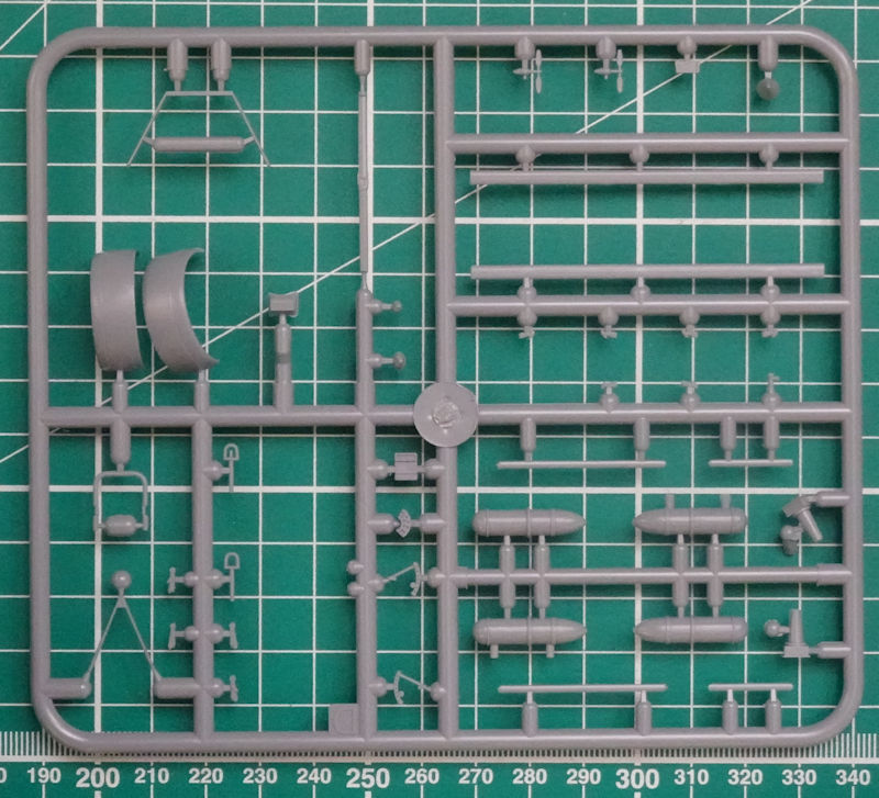 Die Bomben samt Träger hat man sehr filigran gestaltet. Da ist es schon fast eine Selbstverständlichkeit, dass die Abwehr-MGs schon aus der Kiste ordentlich aussehen. Die Luftschraube besteht aus einem Stück und soll als letztes Teil montiert werden.