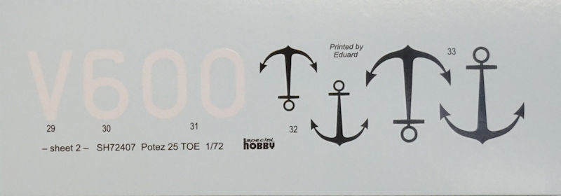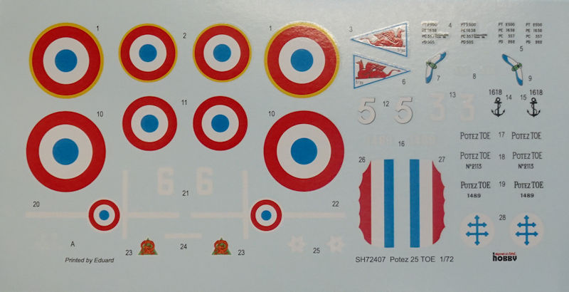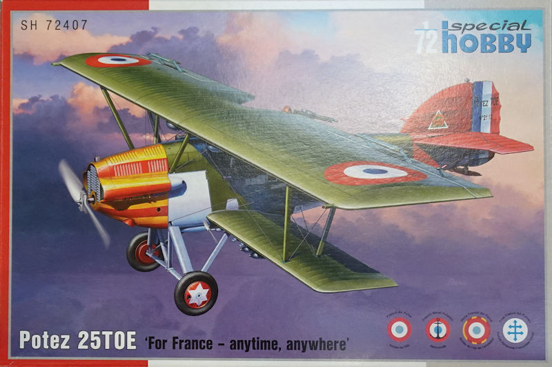 Bausatz: 2019 erschienen bei Azur/FRROM in 1/72 die Potez 25 in zwei verschiedenen Varianten und dieses Jahr legte special hobby die TOE-Variante nach. So befinden sich in dem attraktiven praktischen Stülpkarton fünf graue Spritzlinge mit 141 (!) Teilen, vier Klarsichtteile, ein Fotoätzteilbogen, zwei Decalbögen und die mehrfarbige Bau- und Bemalungsanleitung. Fast alle Bauteile sind aus den Azur/FRROM-Kits bekannt. Es gibt einen neuen Spritzling für den vergrößerten Rumpf mit den Teilen für den Motor.