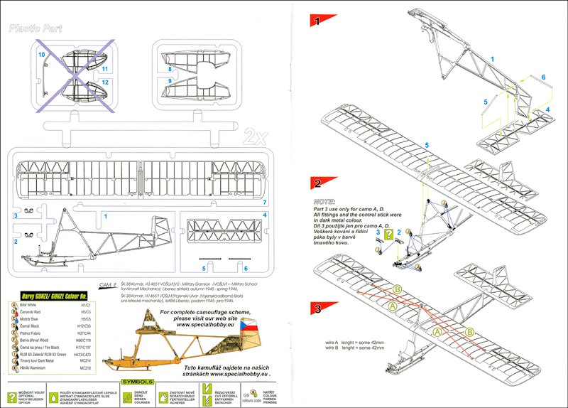 Der farbige, sehr schöne Bauplan führt einen zum fertigen Modell, ein Plan für die Verspannung liegt bei, ein Plan für die Verlegung der Steuerseile fehlt jedoch. Da ist noch ein wenig eigenes Nachforschen angesagt. Das Verspannen dürfte auch das Anspruchvollste an diesem Bausatz sein. Als Farbreferenz wird das Gunze-System verwandt. Die Bemalung der bespannten Flächen könnte eine Herausforderung werden, vielleicht gibt es in der Nähe des Modellbauers noch ein Original, bei dem man die durchscheinende Bespannung studieren kann.