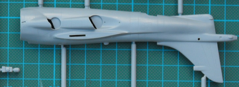 Vor dem Zusammenkleben des Rumpfes sollte man das Buggewicht nicht vergessen. Die Bauanleitung weißt immerhin darauf hin. Leider besteht die Tragfläche aus Ober- und Unterseite. Da wird eine messerscharfe Hinterkante schwierig. Ältere Harrier-Bausätze konnten das besser! Immerhin bestehen die beiden Höhenruder jeweils aus einem Stück. Jetzt gibt es neben den Zusatztanks auch eine ausreichende Bewaffnung. Special Hobby hat einen dritten Spritzgussrahmen dafür hergestellt. Dadurch sind verschiedene Optionen möglich