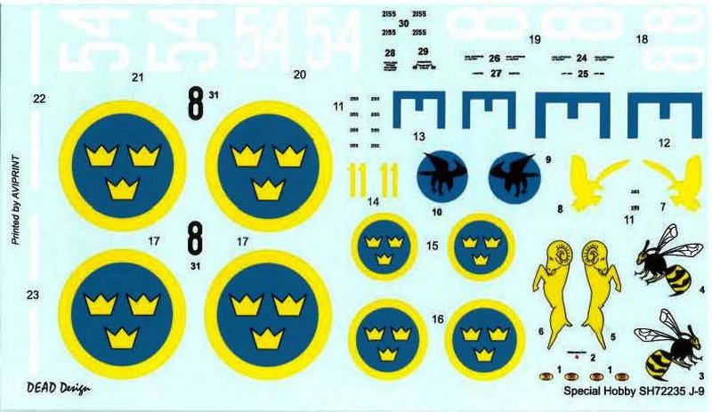 Der sehr sauber gedruckte Decalbogen erlaubt den Bau von vier verschiedenen schwedischen EP-1-106. Und verschieden bedeutet auch verschieden, da vier verschiedene Staffelabzeichen beiliegen.