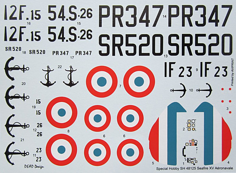 Apropos Decals. Diese erlauben die Darstellung dreier französischer Seafire XV. Das Design und der Druck kommen von Aviprint. Leider ist gerade das Weiß nicht ausreichend opaque und lässt darunter liegende Farbschichten durchscheinen. Die Anleitungen sollte man sich unbedingt in Farbe von der Website von MPM besorgen, da die A4 Zeichnungen selbst für das Anbringen der Decals überschaubar sind. Alle 3 Maschinen haben den A-Frame-Fanghaken.