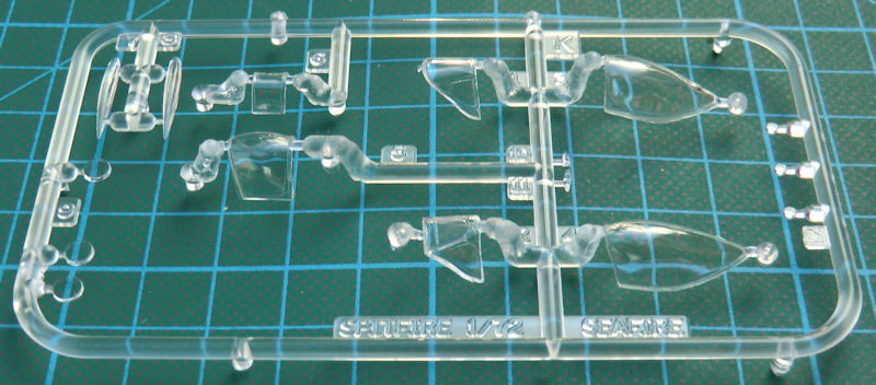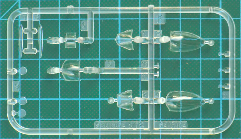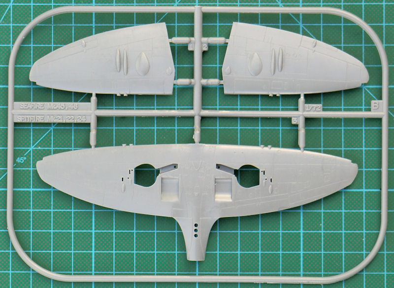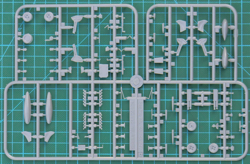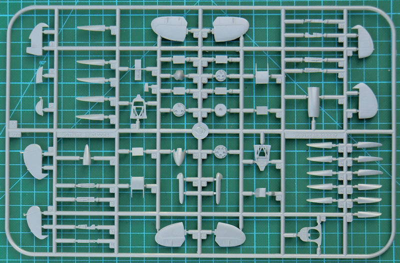 Die Tragflächen sind klassisch geteilt. Es gibt eine Unter- und zwei Oberseiten. Leider sind diese nicht so geteilt, dass man einteilige Ruderabschlüsse erhält. Die Positionsleuchten werden aus Klarsichtmaterial eingeklebt. Dafür sind die beiden Hälften den Höhenleitwerks einteilig und das gilt auch für das Seitenruder. Hier ist der Fanghaken mit anmodelliert. Etwas unglücklich finde ich es, dass die typischen Beulen für den Griffon-Motor einzeln auf den Rumpfbug aufgeklebt werden müssen. Gut gelungen sind die Hauptfahrwerksklappen und auch die Räder. Auch die Bauteile für die beiden Flächenkühler sind in Ordnung.