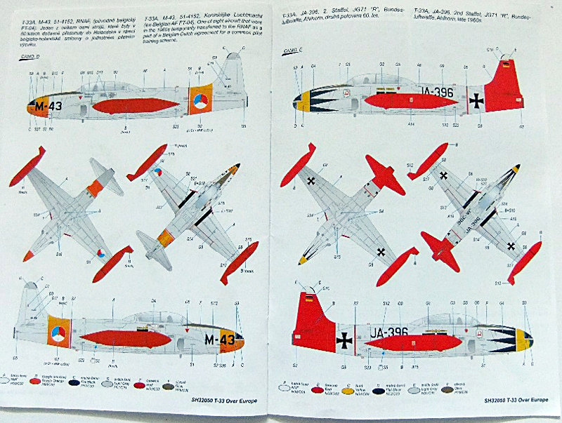 Die drei europäischen Flugzeuge sind aus Frankreich, den Niederlande und der Bundesrepublik Deutschland. Die T-33 der Bundesluftwaffe war 1960 in Ahlhorn stationiert und gehörte zum JG 71 "Richthofen". Am Bug befindet sich auch das für das Geschwader bekannte Tulpenmuster. Alle vier Trainer sind Naturmetall über Alles. Die Kennungen sind teilweise sehr farbenfroh.