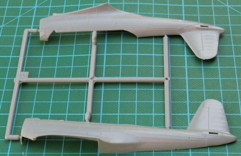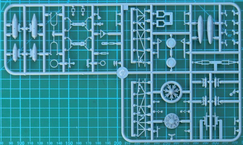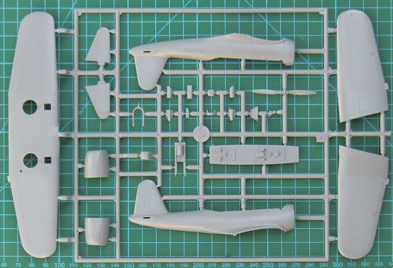 Der Motor entsteht aus zwei Teilen. Dieser verschwindet in der dreiteiligen Motorhaube. Die Tragflächen besteht klassisch aus drei Großbauteilen. Die beiden Hälften des Höhenleitwerks besitzen eine scharfe Hinterkante. Das Fahrwerk sieht ordentlich aus. Damit schließe ich die Fahrwerksscheren ausdrücklich mit ein. Die Abwurfwaffen werden an sehr feinen Aufhängungen befestigt. Die Kanzel besteht aus einem Stück und ist sehr klar.