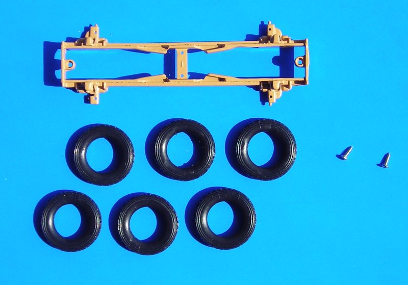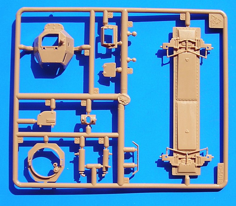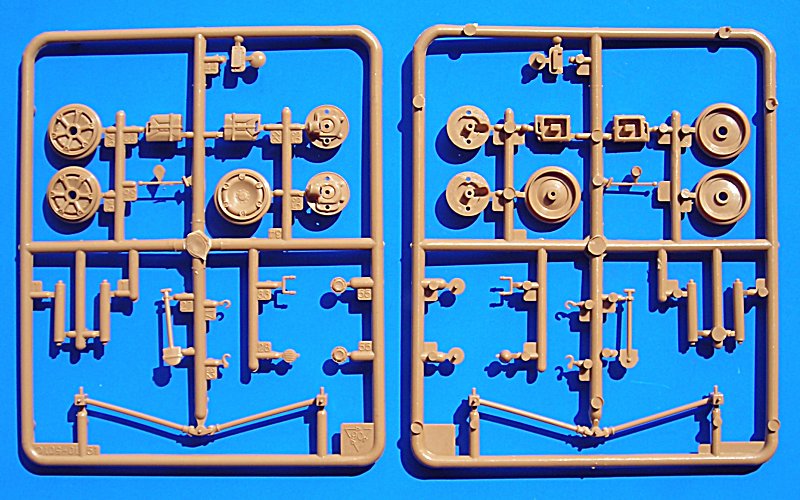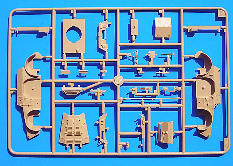 Die 4 Gießrahmen sind sehr sauber und fast ohne Grat abgespritzt, was sich besonders bei der Rohrwaffe sehr positiv bemerkbar macht. Besonderheit für Italeri ist das von vielen Tamiya Modellen bekannte Metalldruckguss-Chassis. Dieses ist jedoch sehr schön detailliert und verschwindet zudem fast vollständig im Innern des Modells. Der Innenraum des Modells ist leer und nur der Turm hat einige Details. Irgendwie will mir aber nicht einleuchten wie der Sitz und die Kanone zusammen passen. Darauf kann nämlich niemand sitzen, weil die Hauptwaffe bis fast an die Rückenlehne reicht.