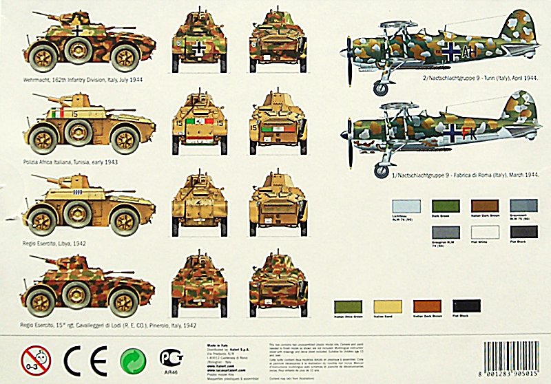 Bausatz: Nun hat sich auch Italeri an den Maßstab 1/48 gewagt. Leider gibt es zunächst nur eine Kombi-Box mit der FIAT Cr.42, zu einem entsprechend hohen Preis (ich habe fast 28 Euro bezahlt). Hier möchte ich mich zunächst auf den AB41 beschränken, weil das Flugzeug bereits länger auf dem Markt ist. Da Italeri dieses gepanzerte Fahrzeug sowohl in 1/72 als auch in 1/35 anbietet, war es eine logische Wahl für den reinkarnierten Militärmaßstab 1/48.