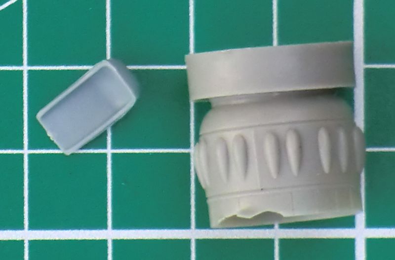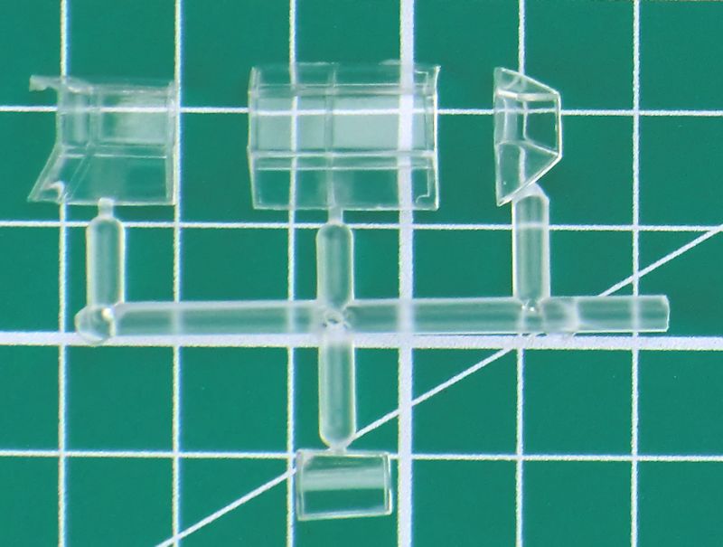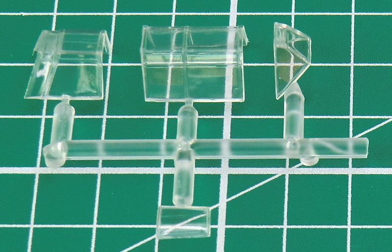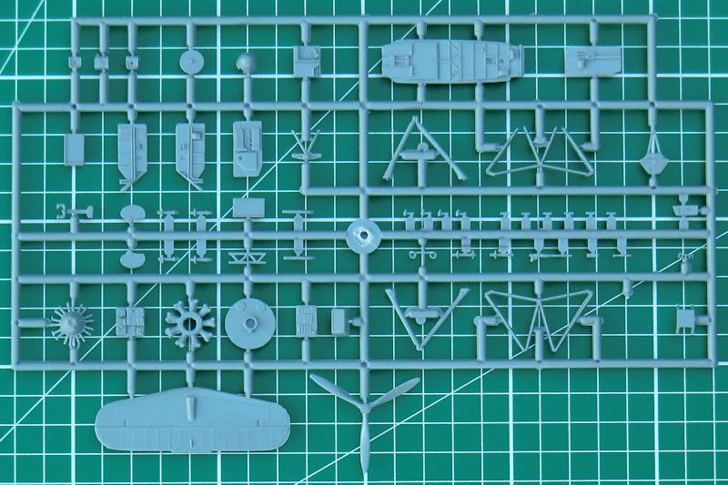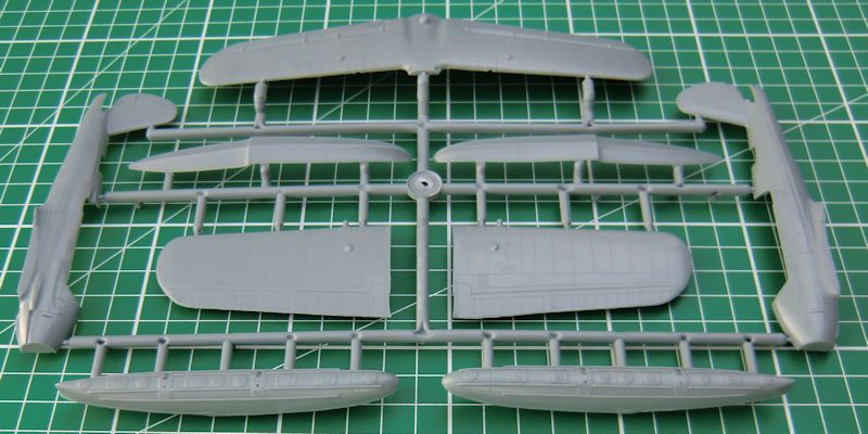 Die Tragfläche hat hier auch ein unteres Teil und zwei obere Hälften. Das Höhenleitwerk ist einteilig und wird von hinten in den Rumpf geschoben. Wenigstens hier gibt es scharfe Hinterkanten. Der Motor besteht aus zwei Teilen. Dafür verschwindet er hinter einer einteiligen Resinhaube. Immerhin passen die Durchmesser zusammen. Leider muss ein Angussblock vorn entfernt werden. Der Verlauf der Verspannungen an den Schwimmern ist gut in der Bauanleitung erkennbar.