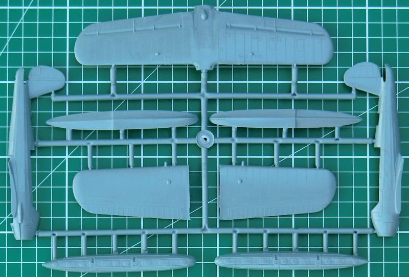 In der attraktiven aber unpraktischen Schüttbox befinden sich gut verpackt zwei graue Spritzgussrahmen mit 65 Teilen, vier Klarsichteile, ein Resinteil, ein Decalbogen und die Bauanleitung. Schaut man sich die Aufteilung der Hauptbauteile an, so erkennt man sofort eine Ähnlichkeit mit dem Heller/Revell-Bausatz. Bei Sword gibt es allerdings versenkte Strukturen. Diese sind aber schön fein.