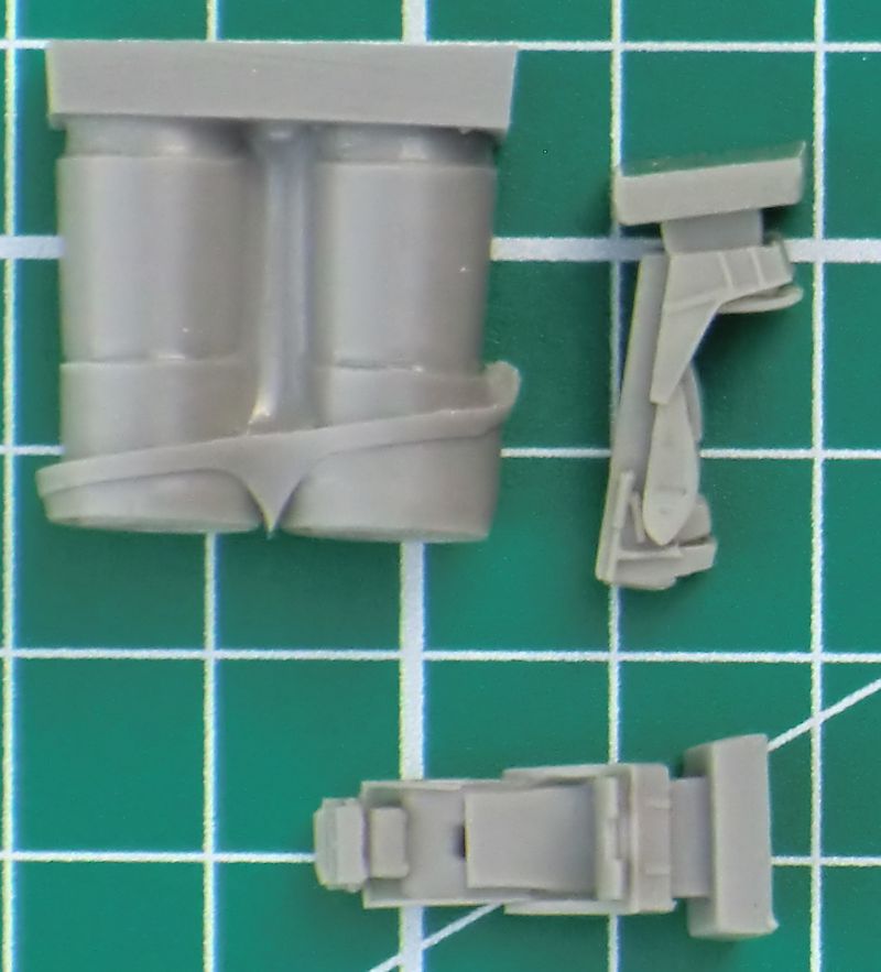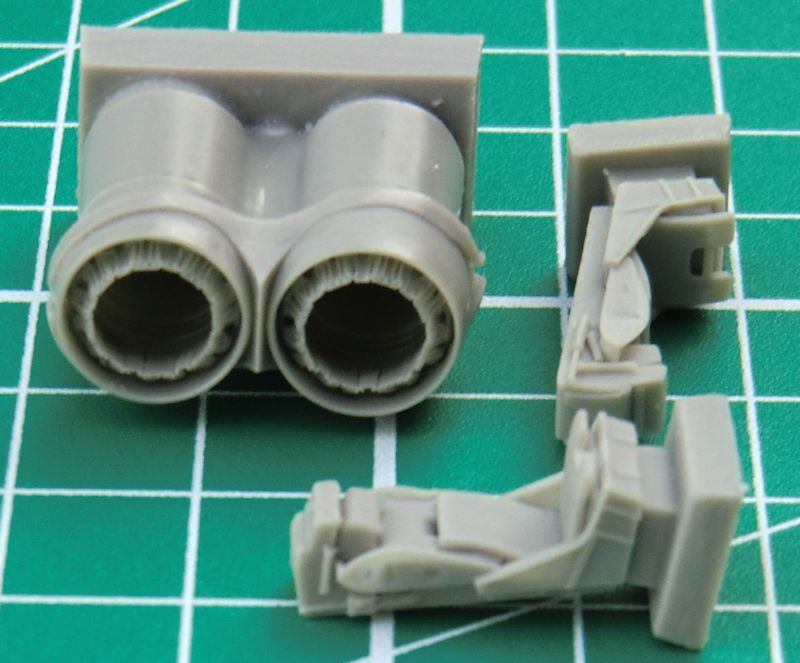 Der Lufteinlauf ist sehr schön gestaltet und ausreichend tief. Im Cockpit werden zwei tolle Schleudersitze aus Resin verbaut. Das Instrumentenbrett einsteht aus mehrfarbig bedruckten Fotoätzteilen. Ein paar kleine Hebel ergänzen die Inneneinrichtung. Hinweise zum Buggewicht fehlen. Man sollte es nicht vergessen. Im Heck gibt es wunderschöne Triebwerksauslässe.