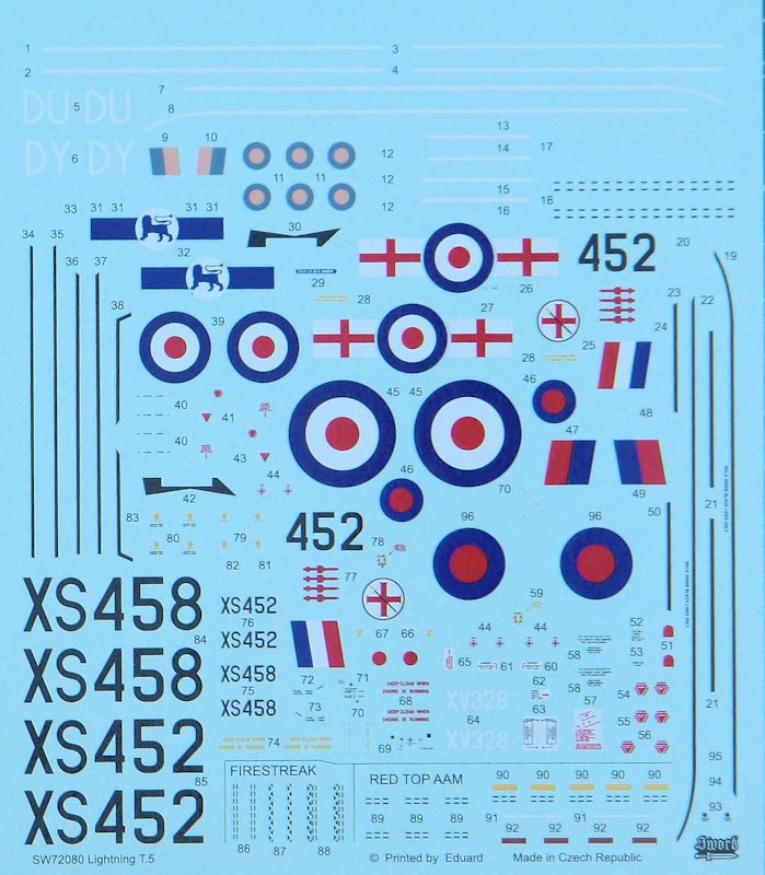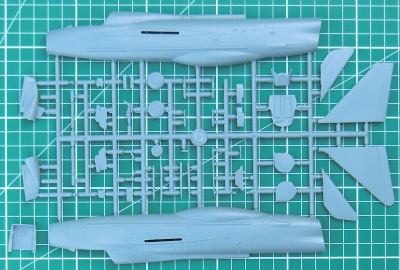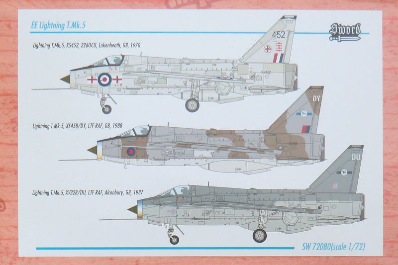 Bausatz: Sword hat seit einiger Zeit ein paar verschiedene E.E. Lightning-Bausätze in 1/72 im Angebot. Darunter ist auch diese doppelsitzige T.Mk. 5. In der attraktiven aber unpraktischen Schüttbox befinden sich gut verpackt zwei blaugraue Spritzlinge mit 86 Teilen, ein klarer Spritzling mit zwei Teilen, vier Resinteile, ein Fotoätzteilbogen, ein großer Decalbogen und die Bauanleitung. Die Spritzgussteile sind typisch Short-Run. Es gibt feine Strukturen und die Kleinteile wirken etwas klobig. Ein wenig erinnern die Bauteile an Airfix-Lightning.