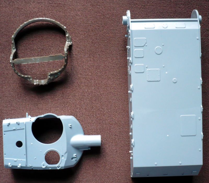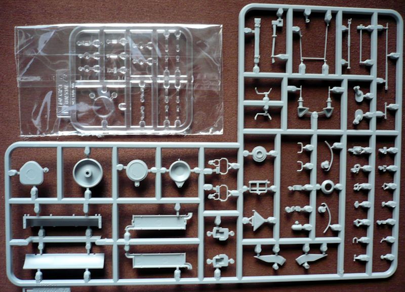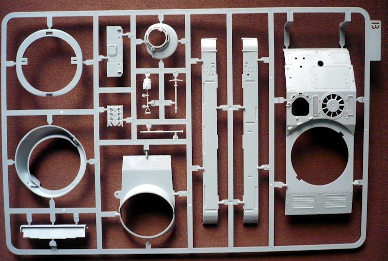 Bausatz: Der anspruchsvolle Bausatz besteht aus über 450 Bauteile, verteilt auf 16 Spritzlinge, 9 Streifen mit Einzelkettenglieder , Wannenunterteil, Turm, Turmplane aus Weichplastik, einem Ätzteilbögen und einem kleinem Abziehbilderbogen.