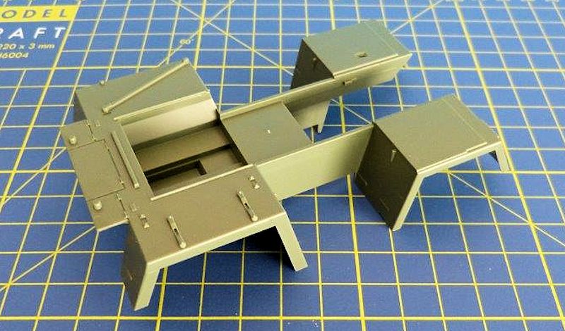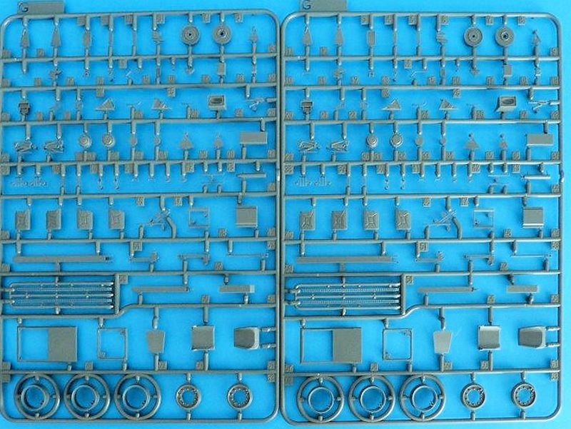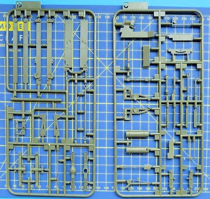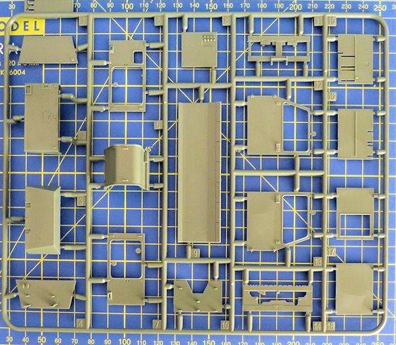 Nach dem Öffnen des bis zum Rand gefüllten stabilen Stülpkartons, fällt einem die gute Gußqualität der einzelnen Bauteile auf. In dem Karton befinden sich das untere Chassis und sechs in dunkelgrüne Gußrahmen. Desweiteren ein relativer großer Spritzling aus Klarsichtmaterial mit Fensterscheiben und der Beleuchtungsanlage. Alle Klarsichtteile sind absolut schlierenfrei. Jeder einzelne Gußast ist in einer Blisterverpackung, die sich auch wieder verschließen lässt. Sehr lobenswert!