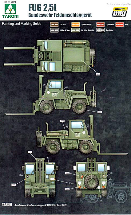 Bemalungsvarianten: Die komplett in Farbe gehaltene Lackierungsanleitung (DinA5) erlaubt, dank der sehr guten matten Decals, die Markierung von vier unterschiedlichen Fahrzeugen: zwei im ISAF Einsatz (Afghanistan) und zwei im heimatlichen Einsatz. Zur jeweiligen Nachschub- u. Transportkompanie gibt Takom leider keine Auskunft. Die Lackierung reicht von Bronzegrün, Gelboliv, der Nato Tarnung (Bronzegrün, Teerschwarz u. Lederbraun) bis zu einem Fahrzeug in Weiß. Takom bezieht sich allein auf das Farbsystem der Firma Mig.