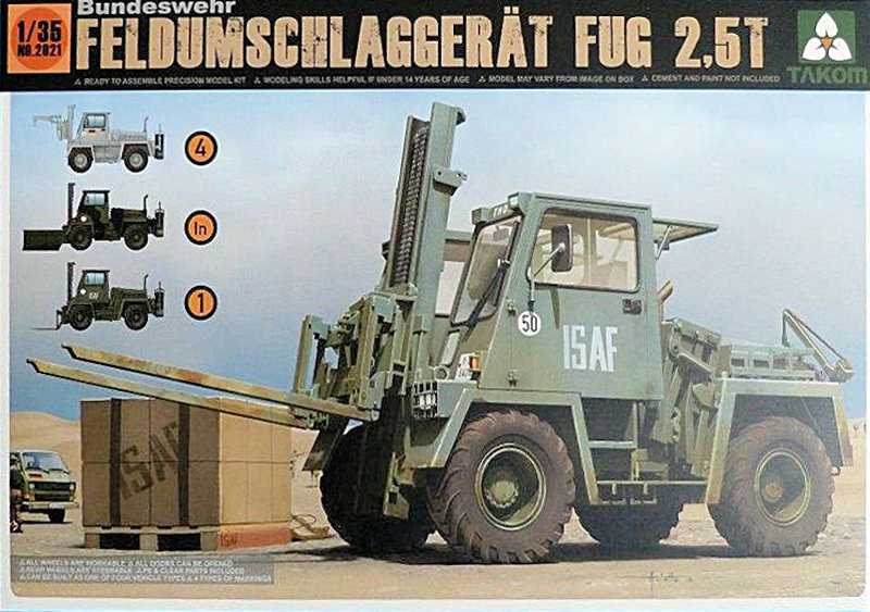 Bausatz: Mit Takom ist ein neuer Modellbauhersteller aus Fernost für gut gemachte Militärfahrzeuge im Maßstab 1:35 erschienen. Waren die ersten Bausätze aus der Zeit des 1.Weltkriegs, wie der britische Mark IV in vielen Varianten, kamen im Laufe der Zeit immer weitere interessante Modelle dazu. Auch der modernen Zeit hat sich Takom verschrieben, wie eine Reihe von Bundeswehrfahrzeugen zeigt. Angefangen über den Leopard 1A5, über zwei Modelle der VW Reihe T3, bis zu einer hervorragenden Nachbildung des Spähpanzers 2 Luchs in der A1/A2 Version, folgt jetzt das Heeresumschlaggerät FUG 2,5 T. Wie ich finde ein sehr interessantes Model, das nur wenige Firmen gewagt hätten als Spritzguss auf den Markt zu bringen.