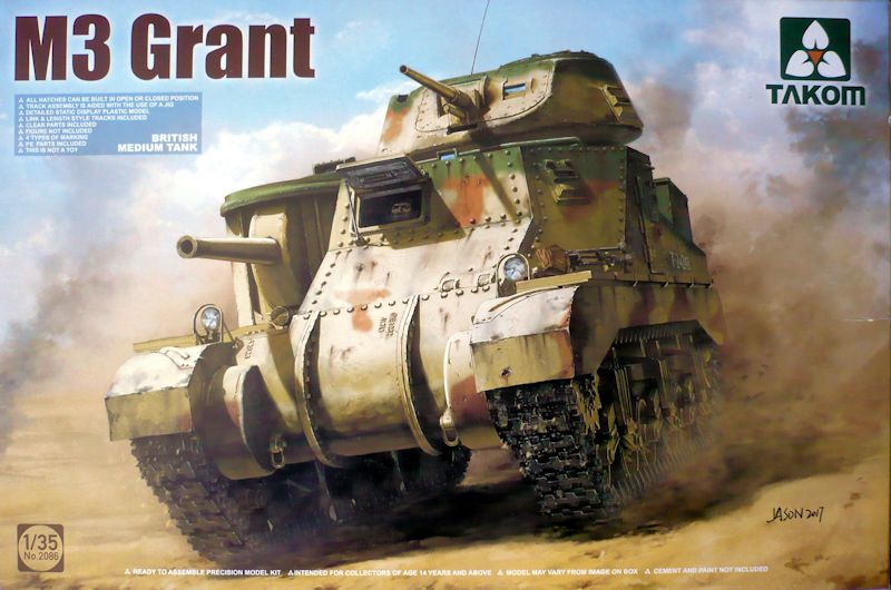 Bausatz: Ende 2017 brachte Takom nach und nach mehrere Ausführungen des M3 heraus. So auch die britische Variante des M3 Grant. Bei dem vorgestellten Kampfpanzer handelt es sich um ein Fahrzeug der frühen Serie und weist somit einige Veränderungen gegenüber der späten Version auf. So besitzt die frühe Serie die markanten Luken an den Seiten. Zusätzlich verfügt der Grant über die außen am Fahrzeug aufgesetzten Staukästen. Die Räderpakete erhielten die korrekten Laufrollen mit offenen Speichen. Dies alles hat Takom in hervorragender Qualität umgesetzt.
