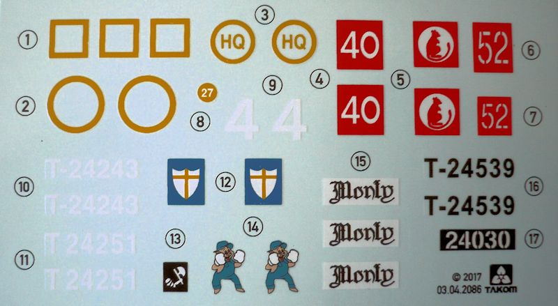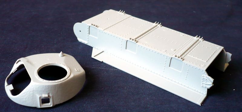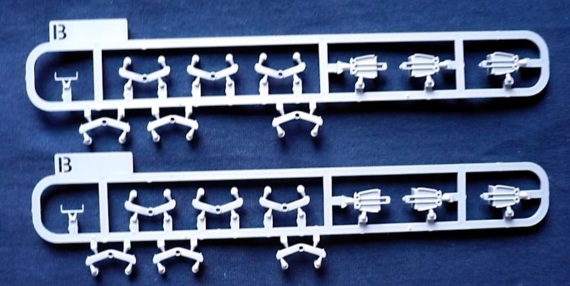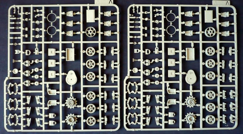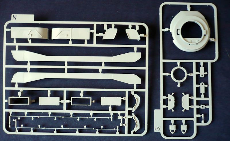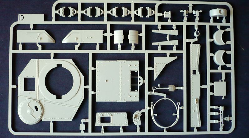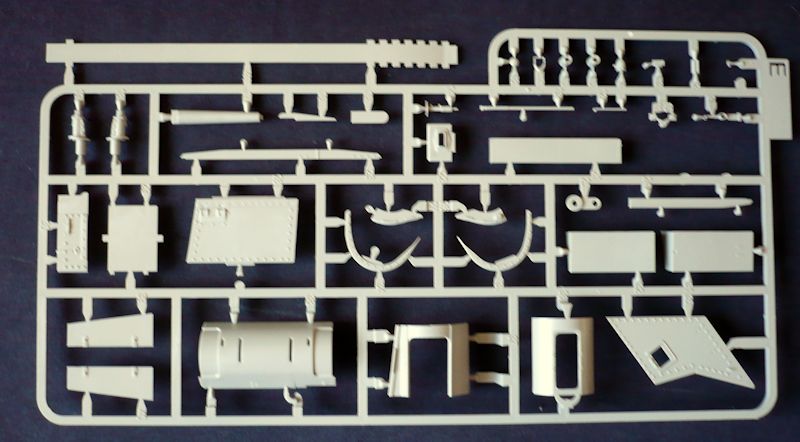 Das Modell entsteht aus 12 Gießrahmen in hellgrauen Kunststoff, der Unterwanne und dem Turm, einem Rahmen mit Klarsichtteilen, einer Ätzteilplatine und einem Abziehbilderbogen. Die Plastikteile sind sehr sauber und filigran gespritzt. Hier wurde alles was heutzutage in der Plastikspritzgusstechnik möglich ist auch umgesetzt. Hervorragende Oberflächenstrukturen und Details überzeugen. Nacharbeiten sind keine zu erwarten. Schemenhaft erkennbare Auswurfmarkierungen befinden sich in nicht sichtbaren Bereichen.
