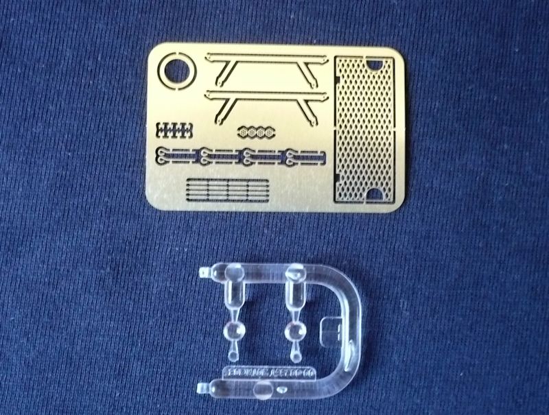 Die Klarsichtteile werden für die Scheinwerfer benötigt. Die kleine Ätzteilplatine dient der Ausgestaltung des Grillgitters sowie einiger weniger Beschläge und den Scheinwerferschutzbügeln.