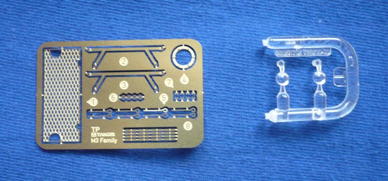 Die Klarsichtteile werden für die Scheinwerfer benötigt. Die kleine Ätzteilplatine dient der Ausgestaltung des Grillgitters sowie einiger weniger Beschläge und den Scheinwerferschutzbügeln.