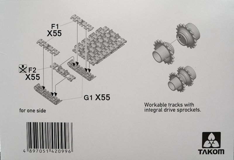 Inzwischen gehört es bei Bausatzneuheiten zum guten Ton, dass Einzelgliederketten beiliegen. Takom hat sich hier nicht lumpen lassen und ein Set mit beweglichen Ketten, für den alten Dragon Bausatz, herausgebracht. Der Satz enthält insgesamt 11 Spritzlinge, mit überzeugenden und knackscharf detaillierten Einzelteilen. Die Spritzlinge sind, Takom typisch, mit durchbrochenen Markierungen versehen was eine große Erleichterung bei der Teilesuche darstellt. Der Bausatz beinhaltet zwei Kettenräder, drei Spritzlinge mit den äußeren Kettenteilen sowie je drei Spritzlinge mit den inneren Teilen und den Verbindern. Für jede Seite werden insgesamt 55 Teile benötigt, um eine Kette fertigzustellen. Takom hat jedoch, insgesamt 120 Teile beigelegt, falls mal etwas daneben oder verloren geht. Die einzelnen Teile sind wirklich hervorragend detailliert.