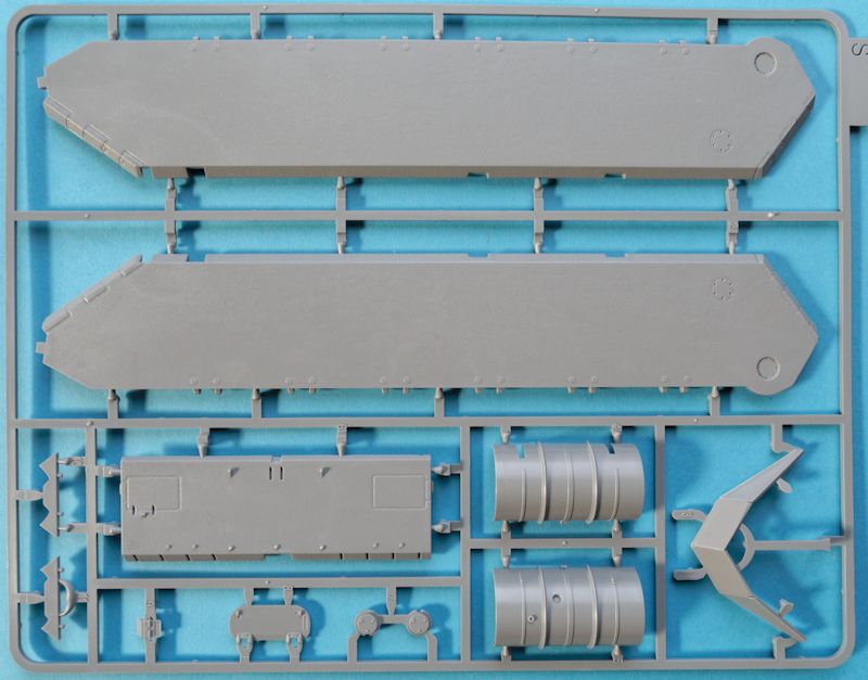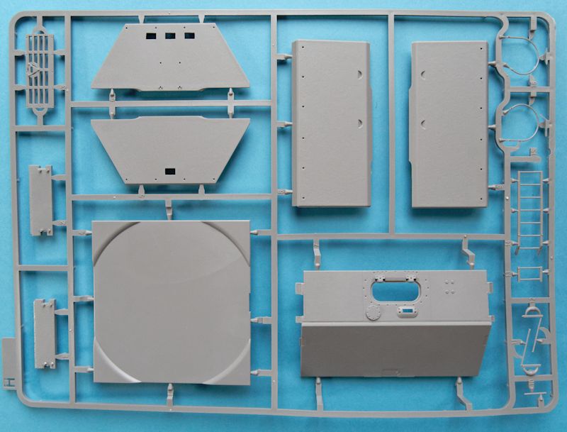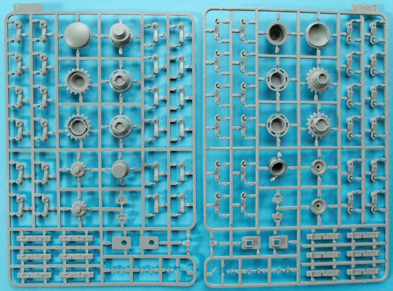 Bausatz: Takom bietet nun beide Versionen dieses Panzers an. Neben der V 1 Version (2049) ist auch die V 2 Ausführung mit Gefechtsturm (2050) erhältlich. Die beiden Bausätze besitzen einige Unterschiede. Der prall gefüllte Karton mit einem schönen Deckelbild, der die erste Versuchsfahrt in Ruhleben zeigt, enthält insgesamt 16 Spritzlinge, einen Ätzteilbogen und einen kleinen Abziehbilderbogen. Die Teile sind gut detailliert und klar strukturiert.