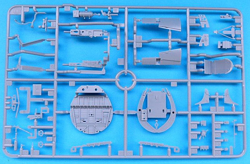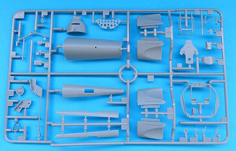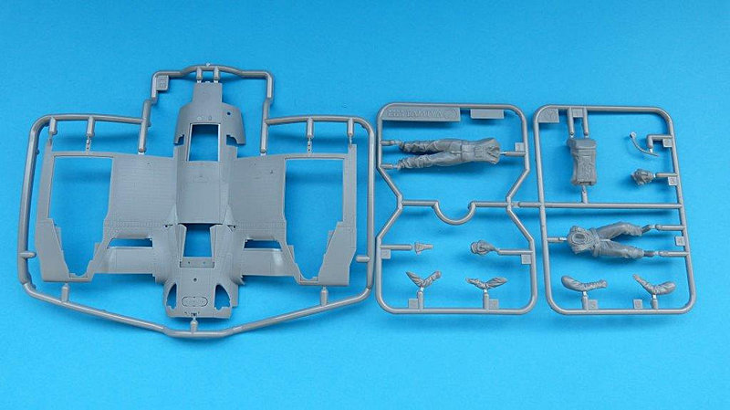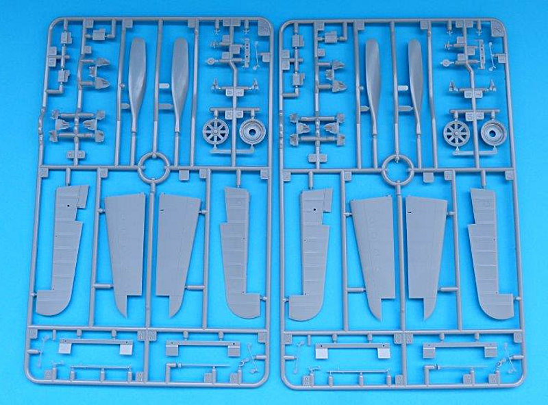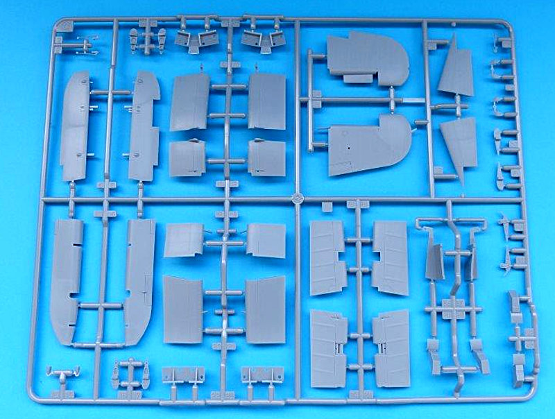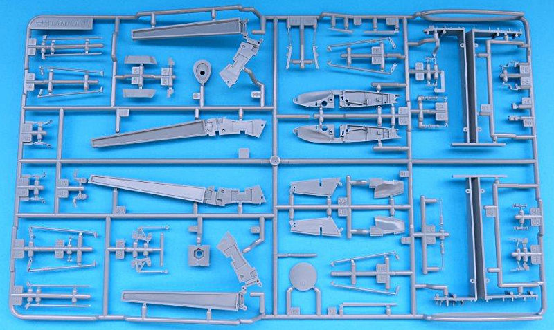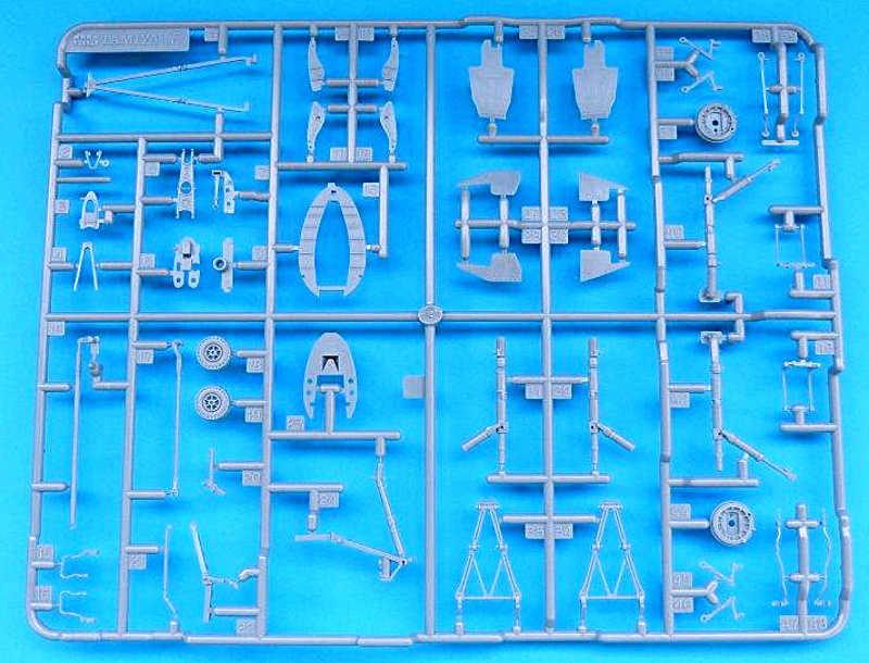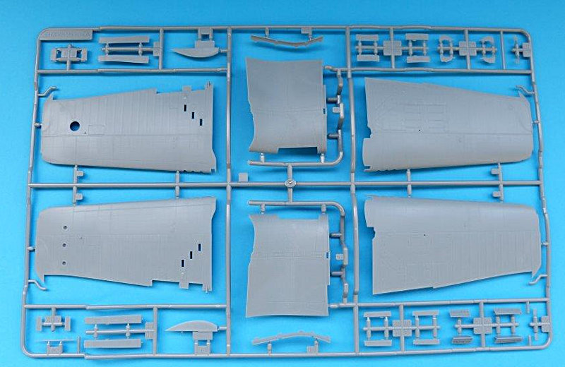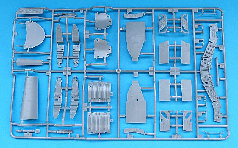 Der große Karton ist mit einer Vielzahl grauer Spritzrahmen reichlich gefüllt. Alle Bauteile weisen die hervorragende Tamiya Qualität auf. Fein versenkte Blechstöße wechseln sich mit wunderbaren reproduzierten Nietenreihen ab. Ein Gußast aus Klarsichtmaterial beinhaltet eine schlierenfreie Kanzel, verglaste Cockpitarmaturen und Positionslichter.