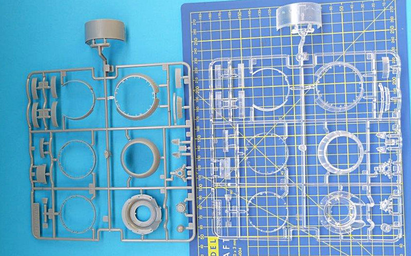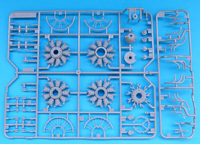 Für die Exportversion des Bausatzes liegt noch ein weiterer Gußast aus Klarsichtmaterial bei. Hiermit kann der Motorraum sichtbar gestaltet werden. Wenn diese Option gewählt wird, sollte der Doppelsternmotor aber noch mit Zündleitungen versehen werden. Der Motor ist eine Augenweide und durch die Vielzahl von Bauteilen ein Modell im Modell.