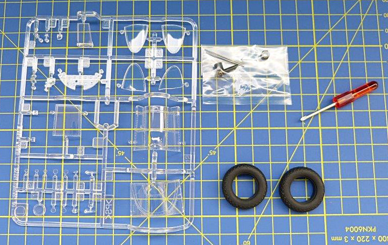Zwei Platinen Ätzteile und ein kleine Klarsichttüte mit dem obligatorischen Kreuzschraubendreher, einer Schraube mit Mutter, zwei Metallachsen und einer Kunststoffnarbe sind in der Box zu finden. Die Vinylreifen weisen ein schönes Profil auf. Maskierfolie für das Abdecken der Kanzel liegt bei.