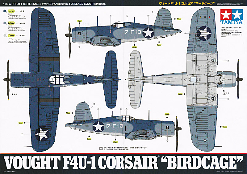 Für die Hauptmarkierungsvariante liegt im ein farbiges A5-Faltblatt bei. Darauf befindet sich ein Vierseitenriss einer Corsair mit Lackierungsangaben. Tamiya bezieht sich auf das hauseigene Farbenprogramm. Da Tamiya die Farbtöne zur Lackierung des Rumpfes nicht als Acrylfarbe vorrätig hat, soll man hier zur Spraydose greifen. Ich persönlich stehe nicht so auf Spraydosen und werde hier auf andere Produkten zurückgreifen.