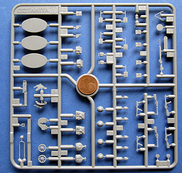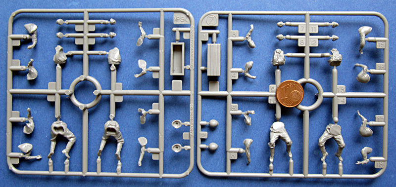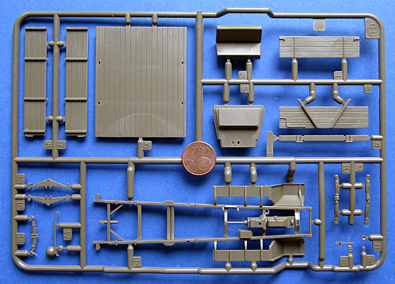 Der Kit enthält 5 Spritzlinge. Zwei grüne für das Fahrzeug und den Fahrer - hier hilft auch noch ein kleiner klarer Spritzrahmen für Scheibe und Scheinwerfer. Zwei graue für die vier Soldaten auf der Pritsche, die eine gewisse Multipose-Gestaltung zulassen. Und schließlich ein bereits bekannter Gießrahmen mit Waffen und Ausrüstung. Decals sind nicht vorhanden.