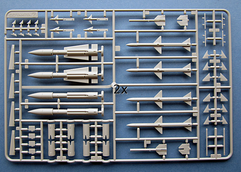 Der große Stülpkarton ist gut gefüllt. Auch zwei Bewaffnungsgießrahmen für je 4 Sidewinder, Sparrow und Phoenix sind enthalten. Insgesant ist der Bausatz für einen einfachen Zusammenbau bei guter Detaillierung ausgelegt. Insbesondere der Flügel ist so dargestellt, dass alle Klappen und Spoiler eingefahren dargestellt werden. Das spart Teile und Baustunden… aber es sind trotzdem mehr als 370 Teile im Bausatz. Außerdem hat Tamiya hier auch Masken beigelegt, die aber noch auszuschneiden sind.