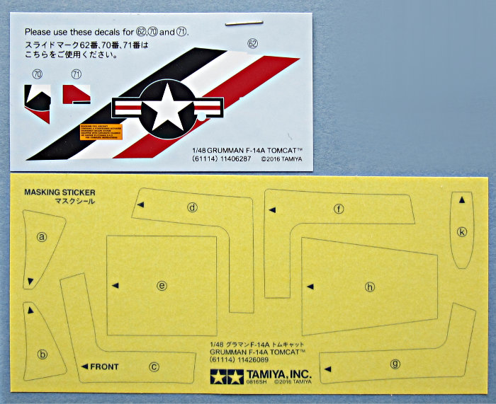 Die Decals befinden sich auf einem großen Bogen für die Markierungen und einem etwas kleineren mit Wartungshinweisen und Waffenmarkierungen. Für die Hi-Viz Variante (2) mit "Bi-Centennial-Motiv" gibt es auch noch einen kleinen Korrekturbogen. Der Druck ist sauber und ohne Versatz ausgeführt. Bisher habe ich immer gute Erfahrungen mit den Tamiya-Decals gemacht, so dass ich hier nichts Anderes erwarte.