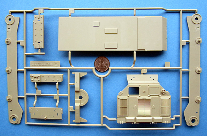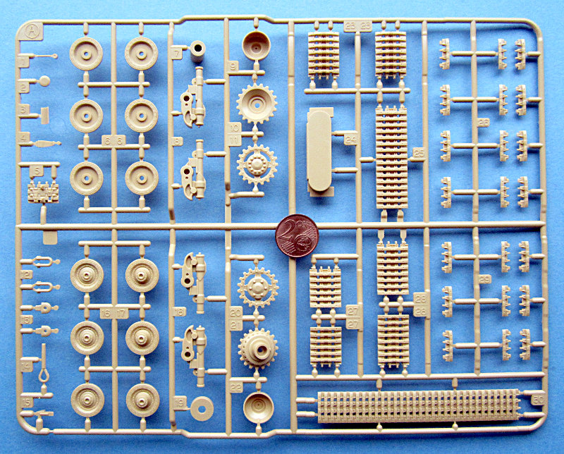 Die Ketten liegen im bekannten „Link and length“-System bei, das ich sehr mag. Zwei der fünf Spritzlinge befassen sich nur mit dem Laufwerk! Weiterhin liegen etwas Garn zur Darstellung der Abschleppseile, Polycaps und 4 Gewichte bei. Letzere sind in Folie eingepackt und in eine Ecke des Kartons geklebt. Ich bin wirklich froh, dass Tamiya mittels dieser Gewichte arbeitet und die Metallwannen aufgegeben hat…