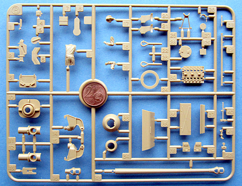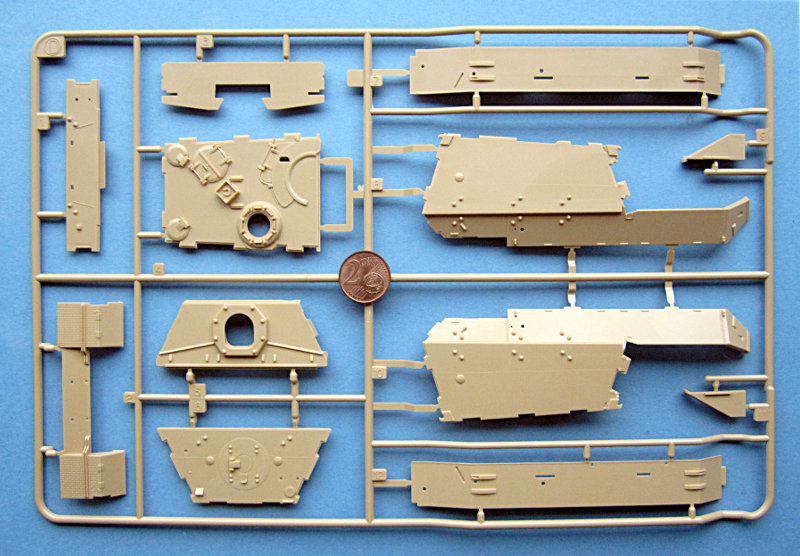 Unter- und Oberwanne werden jeweils in Kastenbauweise erstellt, also Seitenwände und „Deckel“. Die Kasemattenseitenwände sind dabei Teil der Oberwanne. Wie schon geschrieben: Alles ist auf einfachen Zusammenbau ausgelegt! Das Rohr ist einteilig und die Mündungsbremse ist bereits mit einer Hälfte angegossen, die andere Seite muss man noch ankleben. Die Formtrennaht ist minimal, so dass man mit etwas Vorsicht ein rundes Rohr behält. Etwas störend ist hier allerdings der Anguss. Im Inneren des Modells gibt es nichts außer einer rudimentären Aufnahme für das Geschütz. Wie auf dem Titel abgebildet, gibt es eine gute Kommandantenhalbfigur im Bausatz.