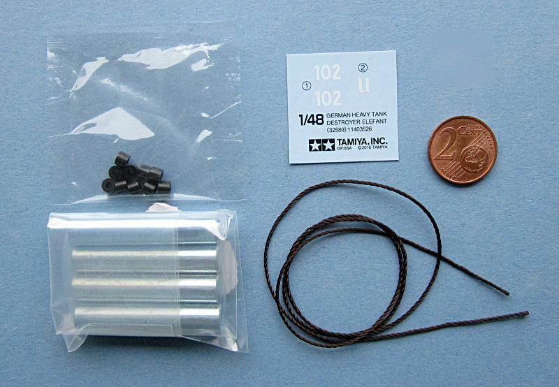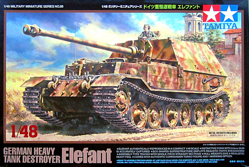 Bausatz: Ende 2016 hat Tamiya den Panzerjäger Elefant in der 1/48er Militärbausatzreihe herausgebracht. Wie für diese Produktlinie üblich, ist der Bausatz insgesamt einfach aufgebaut und sollte schnell zu einem ansprechenden Ergebnis führen. Unter dieser Prämisse ist auch der Verkauf des Zimmerit-Klebefoliensatzes zu verstehen. Dabei ist der Bausatz aber nicht detailarm, es wurde lediglich etwas vereinfacht und Baugruppen zu Bauteilen zusammengefasst. Wie üblich kann man auch wieder Gewichte in das Modell einbauen.